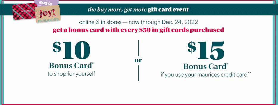 The best gifts for every occasion are Maurices Gift Cards! Give your female friend the card and let her shop wherever she wants. The gift cards range in value from $10 to $500. Users who spend over $50 will receive a free bonus reward card worth up to $15. Maurices even allows you to include a personalised message with the gift card, and users can redeem the gift card amount both online and in-store.